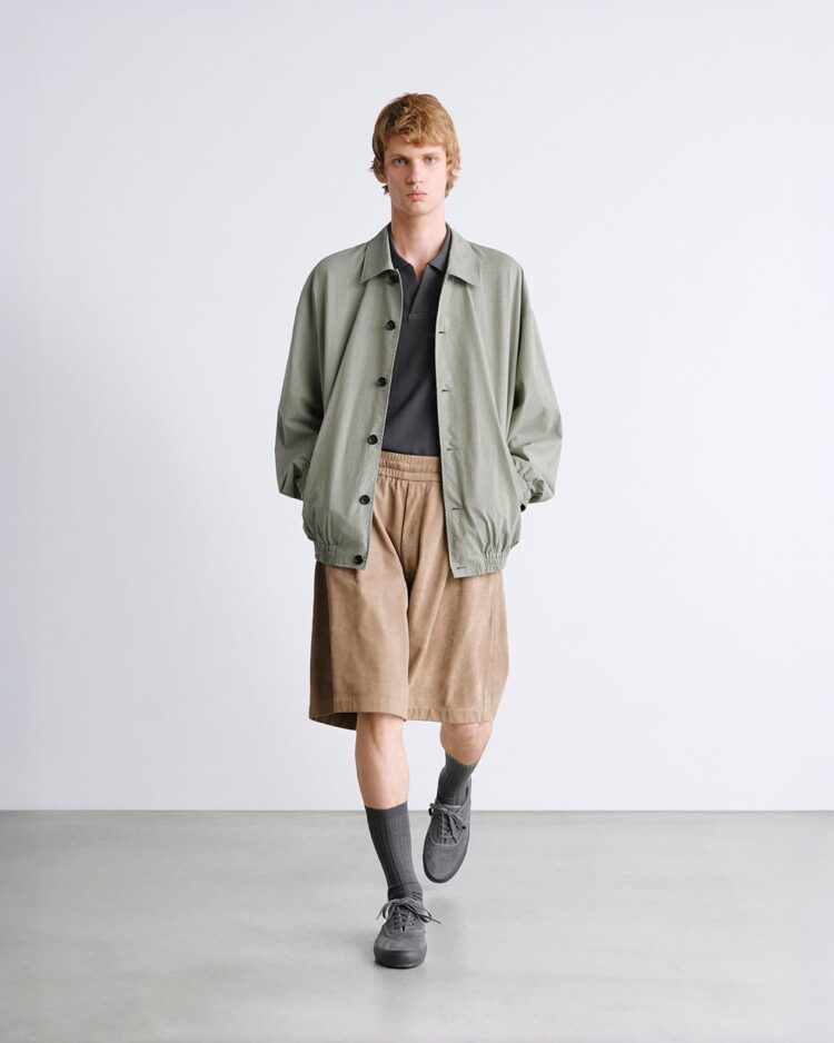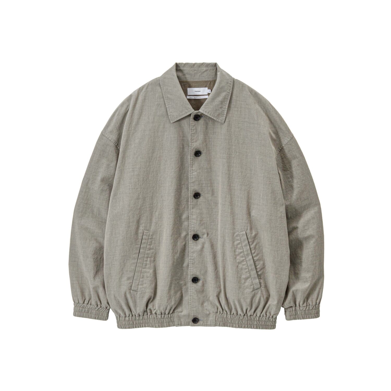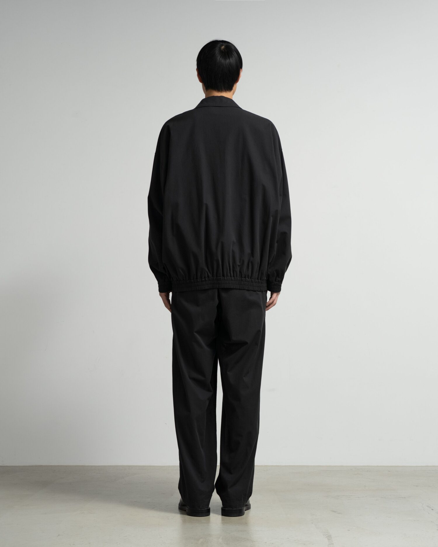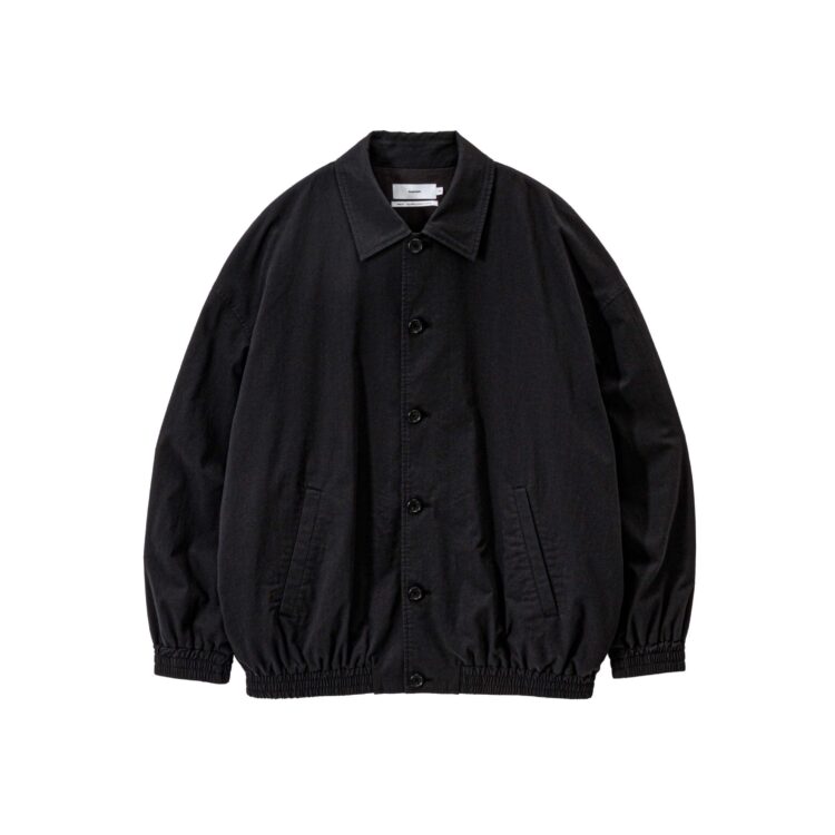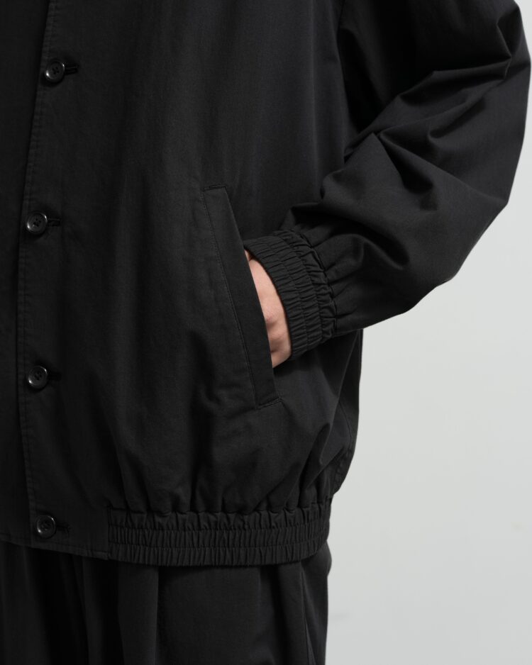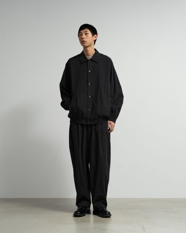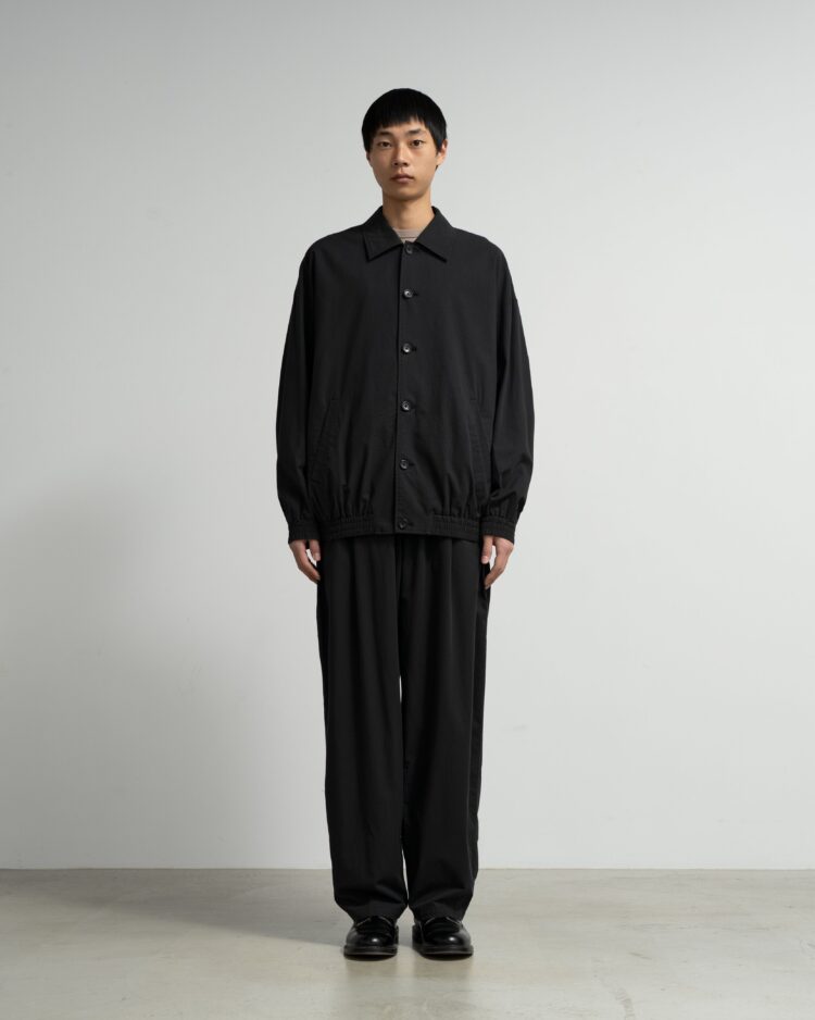綿とウールをブレンドした糸で織り上げたポプリン素材。スーツ生地規格をシャツ専用の設計に落とし込むことで、より薄手に仕上げ通気性を向上させた。混紡糸特有の奥行きがある豊かな杢表現がクラシックな印象を。袖口と裾にシャーリングゴムを配したショート丈のボタンアップジャケットに仕立てた。製品洗いを施すことで、パッカリングによる自然な表情と柔らかな風合いを加えている。