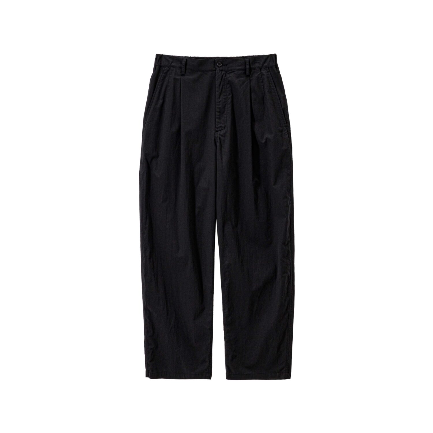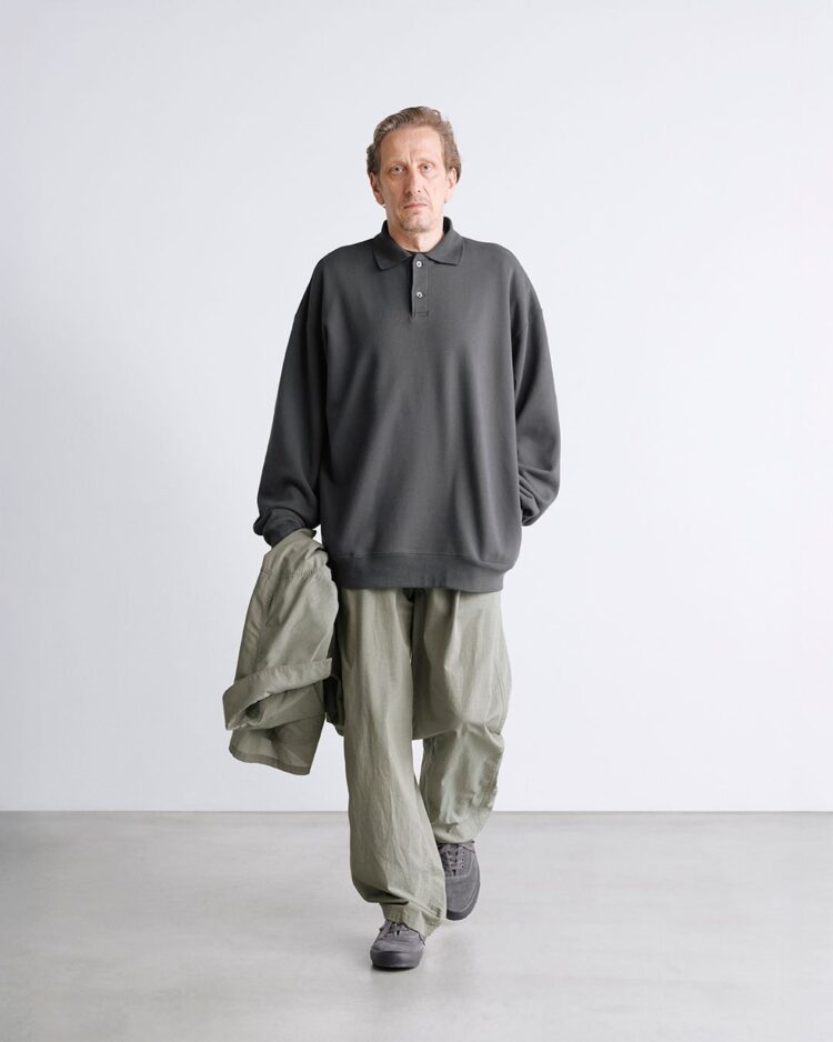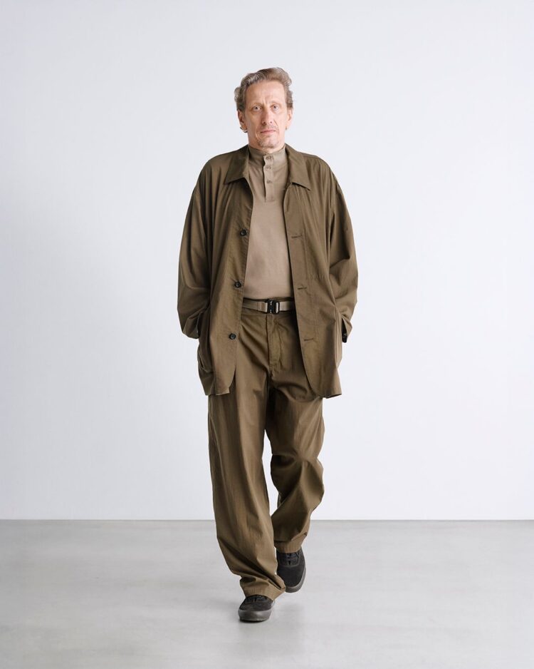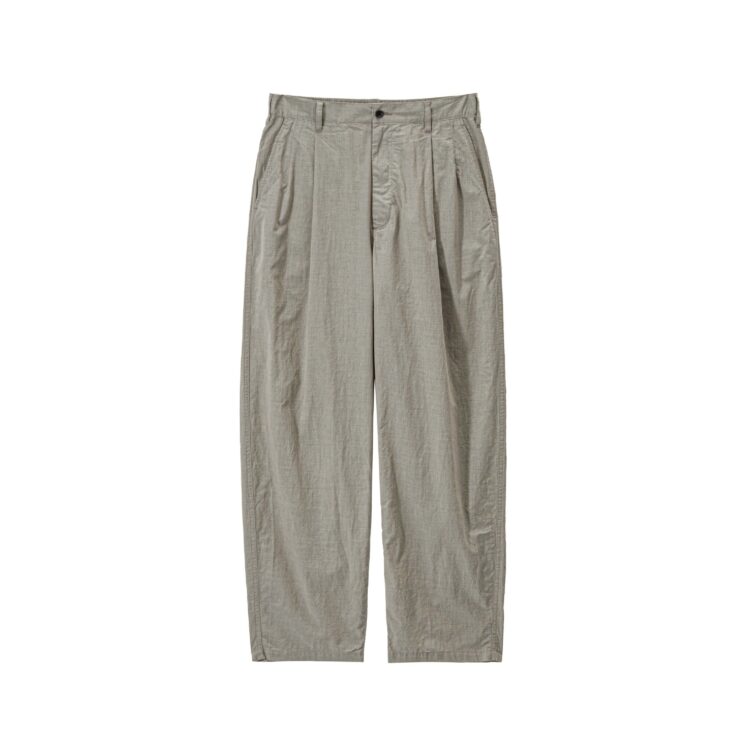綿とウールをブレンドした糸で織り上げたポプリン素材。スーツ生地規格をシャツ専用の設計に落とし込むことで、より薄手に仕上げ通気性を向上させた。混紡糸特有の奥行きがある豊かな杢表現がクラシックな印象を。オーバーサイズスラックスをベースに、やや裾巾と腰回りにゆとりを持たせた新シルエット。製品洗いを施すことで、パッカリングによる自然な表情と柔らかな風合いを加えている。