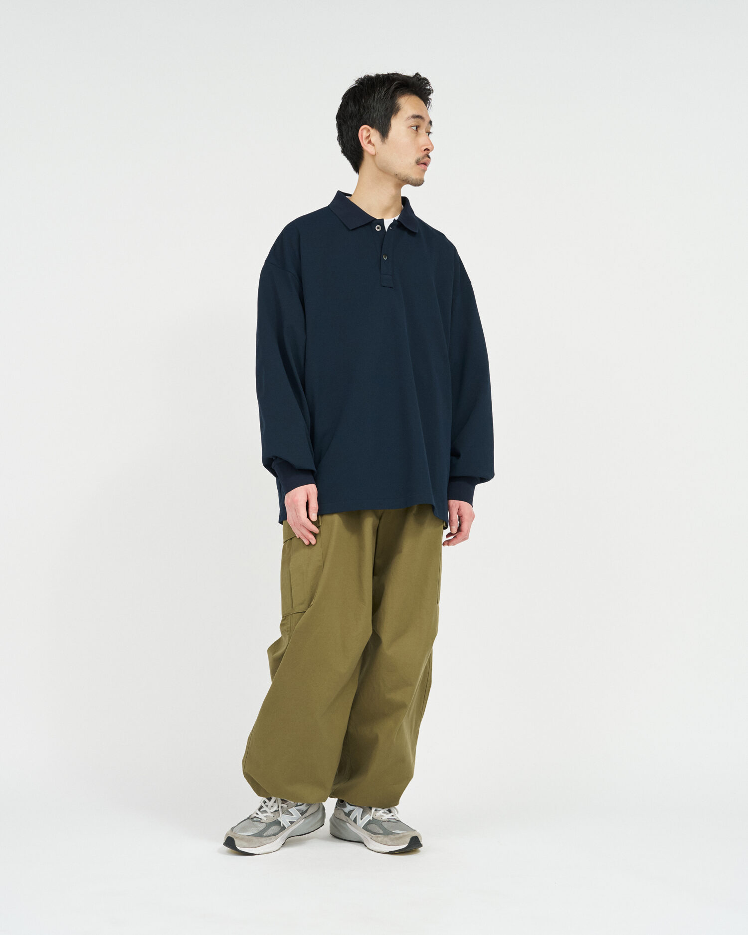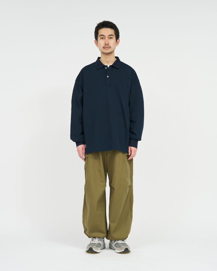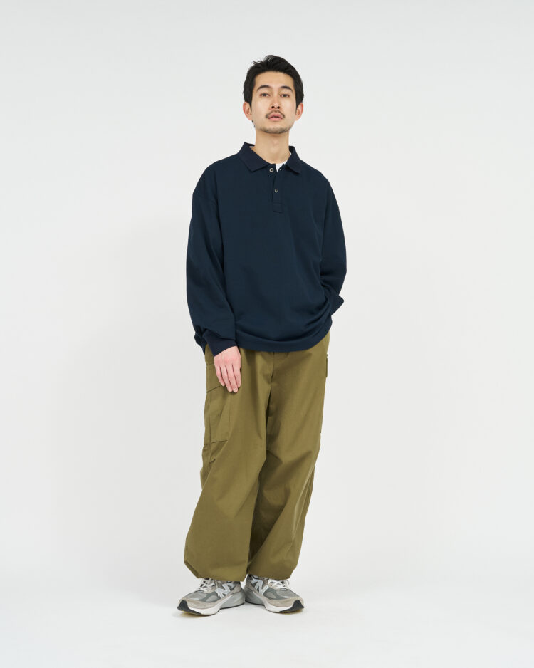 往年のU.Sトロピカルトラウザーがデザインソース。オリジナルのディテールを忠実に再現にしながらも一枚でも存在感のある一着に。ヒップ周りから裾まで極太のストレートシルエットでボリュームのあるサイジングに刷新。ウエストのサイドアジャスターをゴムでつなぎ合わせる事により腰まわりの伸縮性が増し、快適な着心地。裾にドローコードを設けてありシルエットが可能。無骨なミリタリーファブリックに、長年着込んだようなフェード感を加えることで、深みのある表情に。