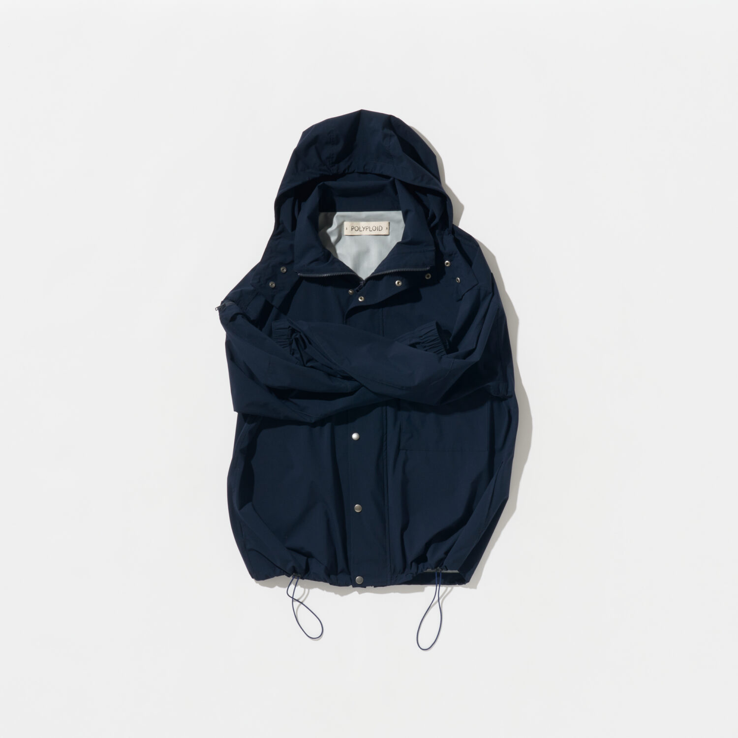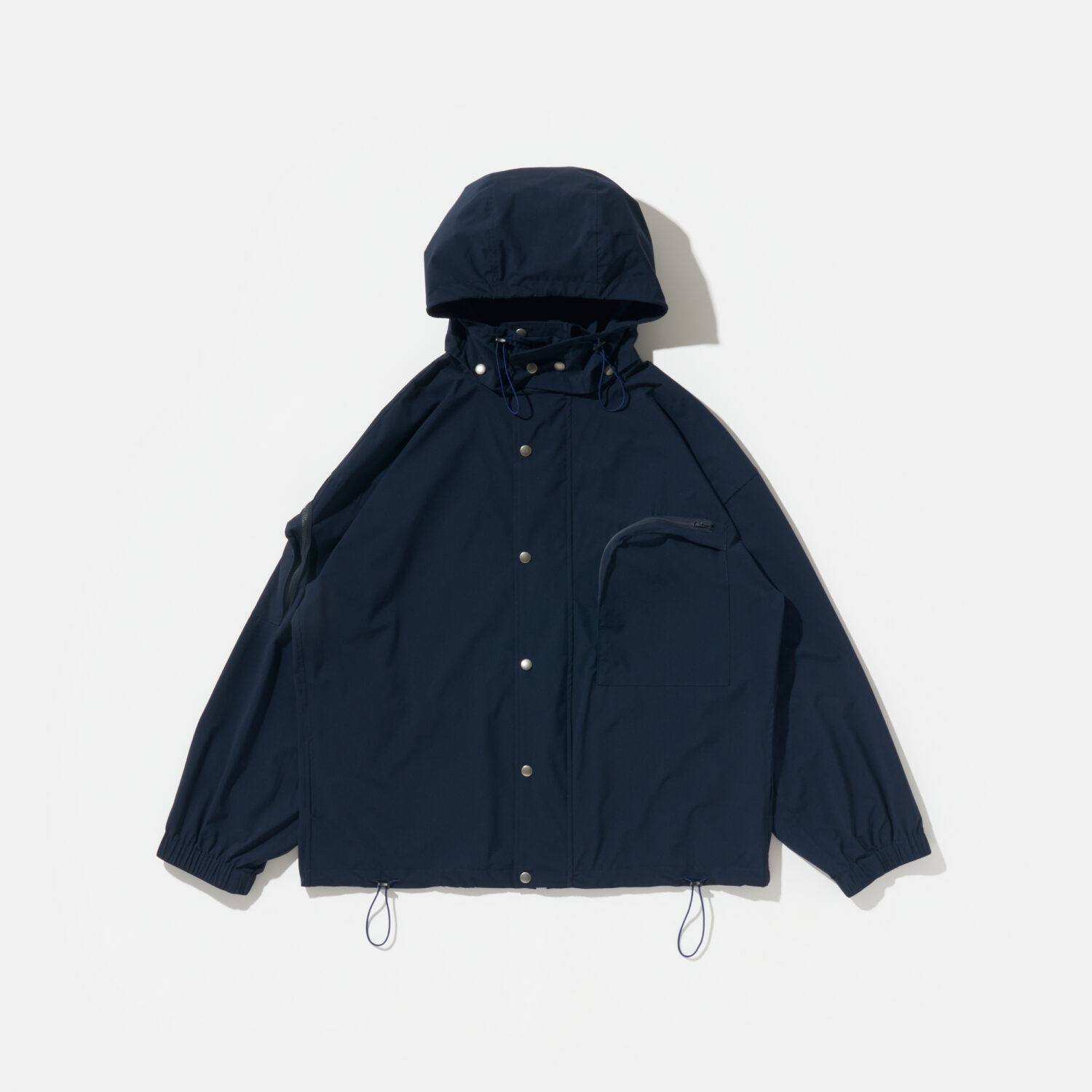 ドローコード付きフードは着脱可能。左胸、右袖にマチ付きのポケットあります。