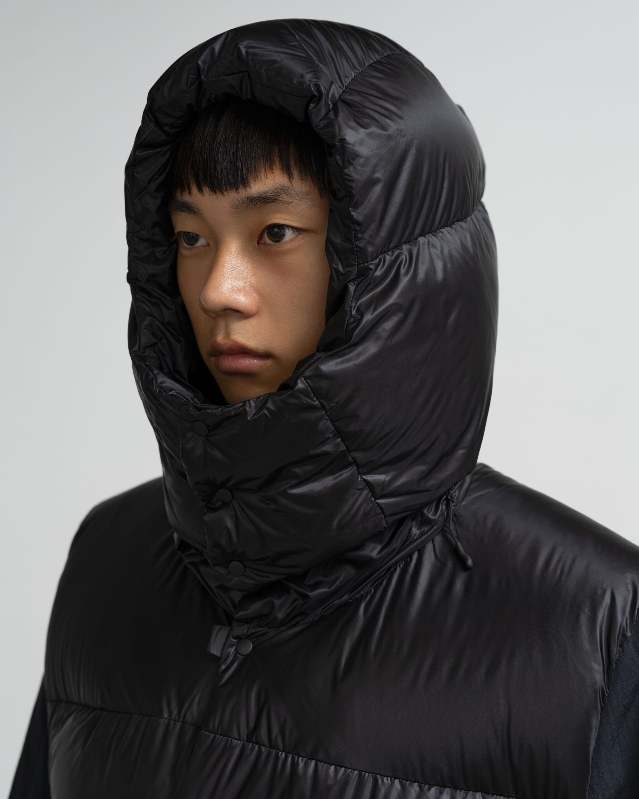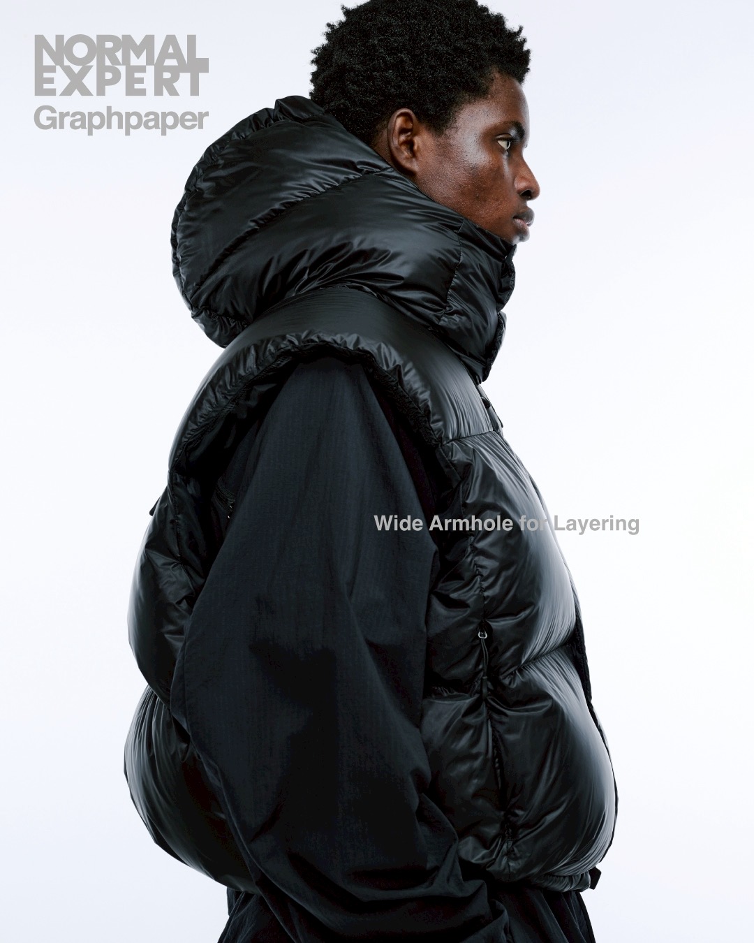 10月25日(土)より、NNORMAL EXPERTとGraphpaperのコラボレーションアイテムを発売いたします。今回は、300日/年の着用を想定した速乾性のあるブルゾンをGraphpaperらしいゆとりのあるシルエットに変更したOVERSIZED 300 BLOUSONに加えて、5℃以下の環境で300 BLOUSONへの重ね着を想定したアイテムとして新たに登場するFLOAT PANELを別注で展開します。重ね着を想定して大胆に設計されたアームホールが特徴のOVERSIZED FLOAT PANELは、多くの空気を含み復元性に優れたグースダウンを採用し、体温の半分以上が逃げるとされる頭部と肩まわりを効果的にカバーします。また、丈を短めに設定することで、インナーに着たブルゾンのポケットへのアクセスを確保しながら、混み合った車内などでもかさばらない快適な着用感を実現。さらに、ブルゾンとベンチレーション位置を重ねることで、レイヤード時にも衣服内のコンディションを快適に保ちます。ハードな環境下で必要な機能ではなく、実際のデータと日常生活の中で検証を重ねることで生み出される、日常であったら良いという機能を備えたデイリーウェアです。