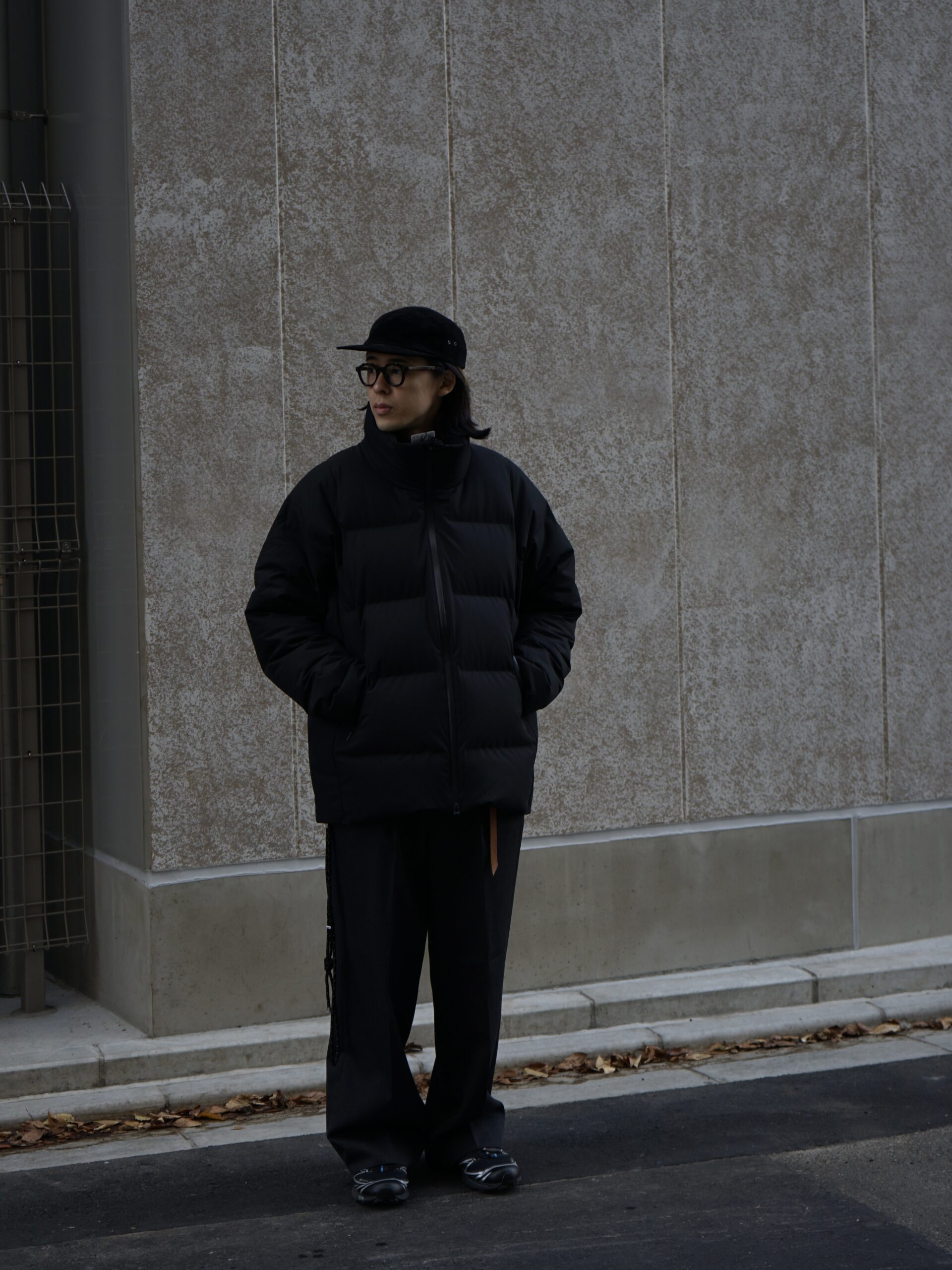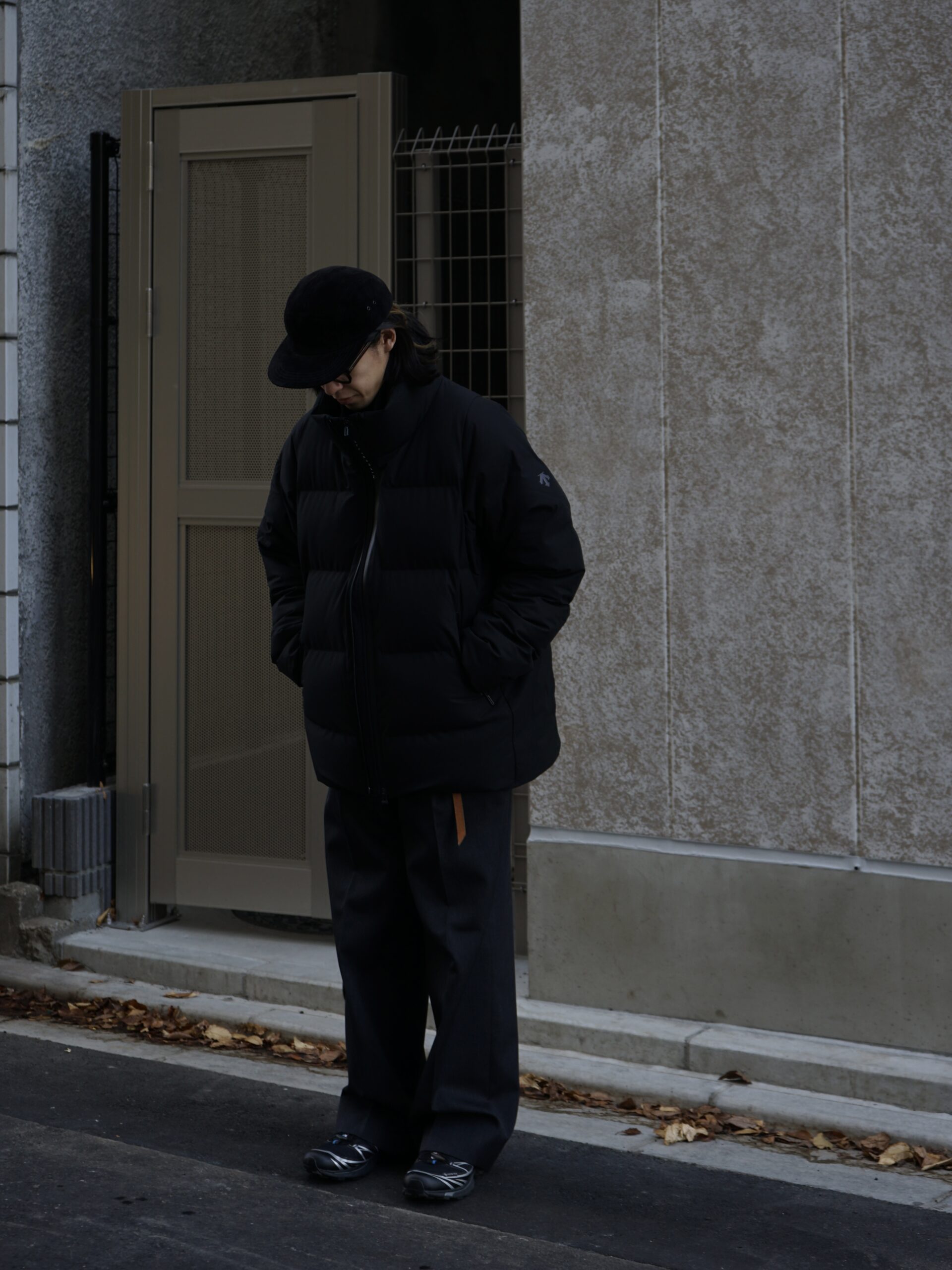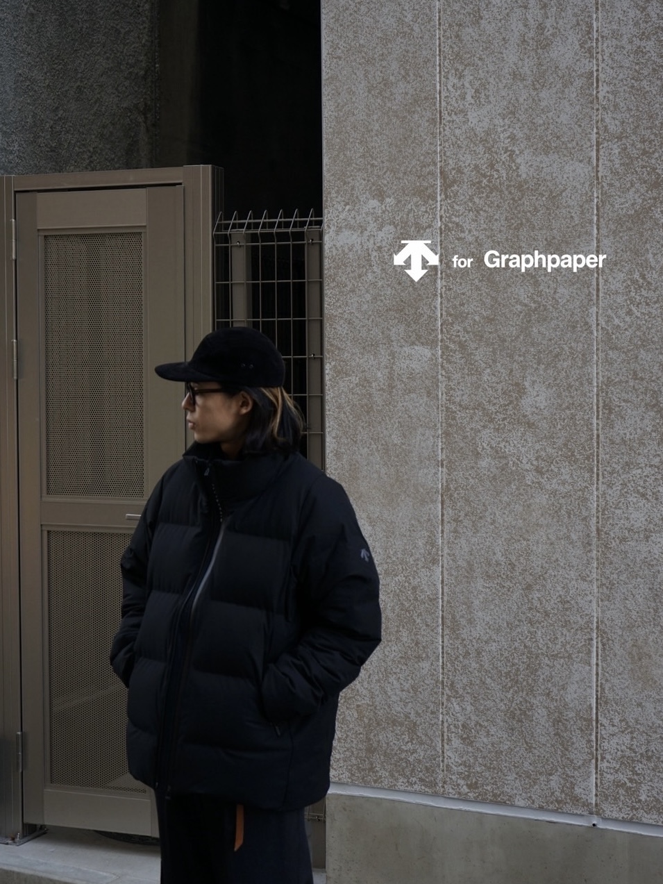 DESCENTEとGraphpaperとのコラボレーションによるダウンジャケット、DESCENTE for Graphpaper ”Oversized ANCHOR”。前回同様にDESCENTEを象徴する初期モデル、「ANCHOR」をベースにスポーツウェアのように身体へ密着させて保温性を高める設計ではなく、都市生活における快適性と余白あるシルエットを重視して再構築しました。肩の傾斜を美しく見せるパターンワークや、人気モデル「マウンテニア」にも採用されるセットインラグランスリーブにより、襟から袖口にかけて自然な丸みを帯びた洗練されたフォルムを実現しています。