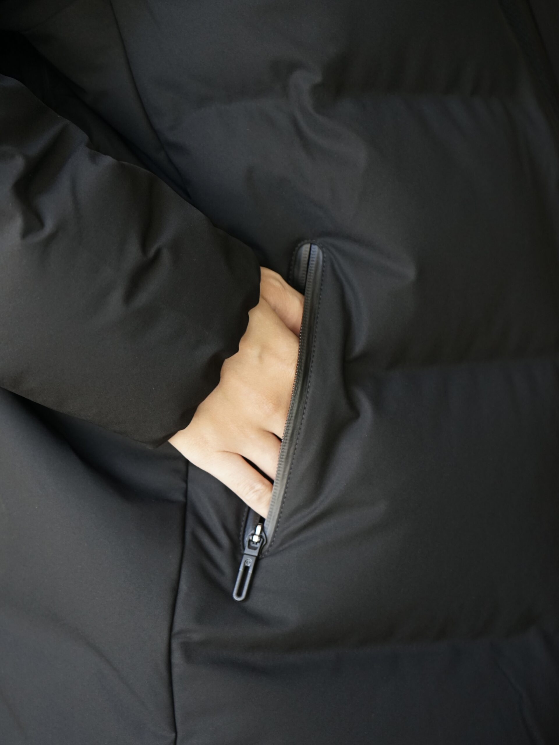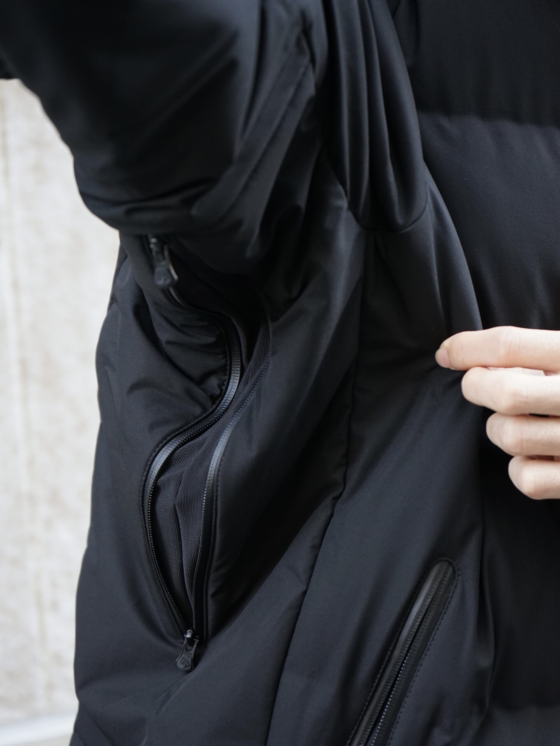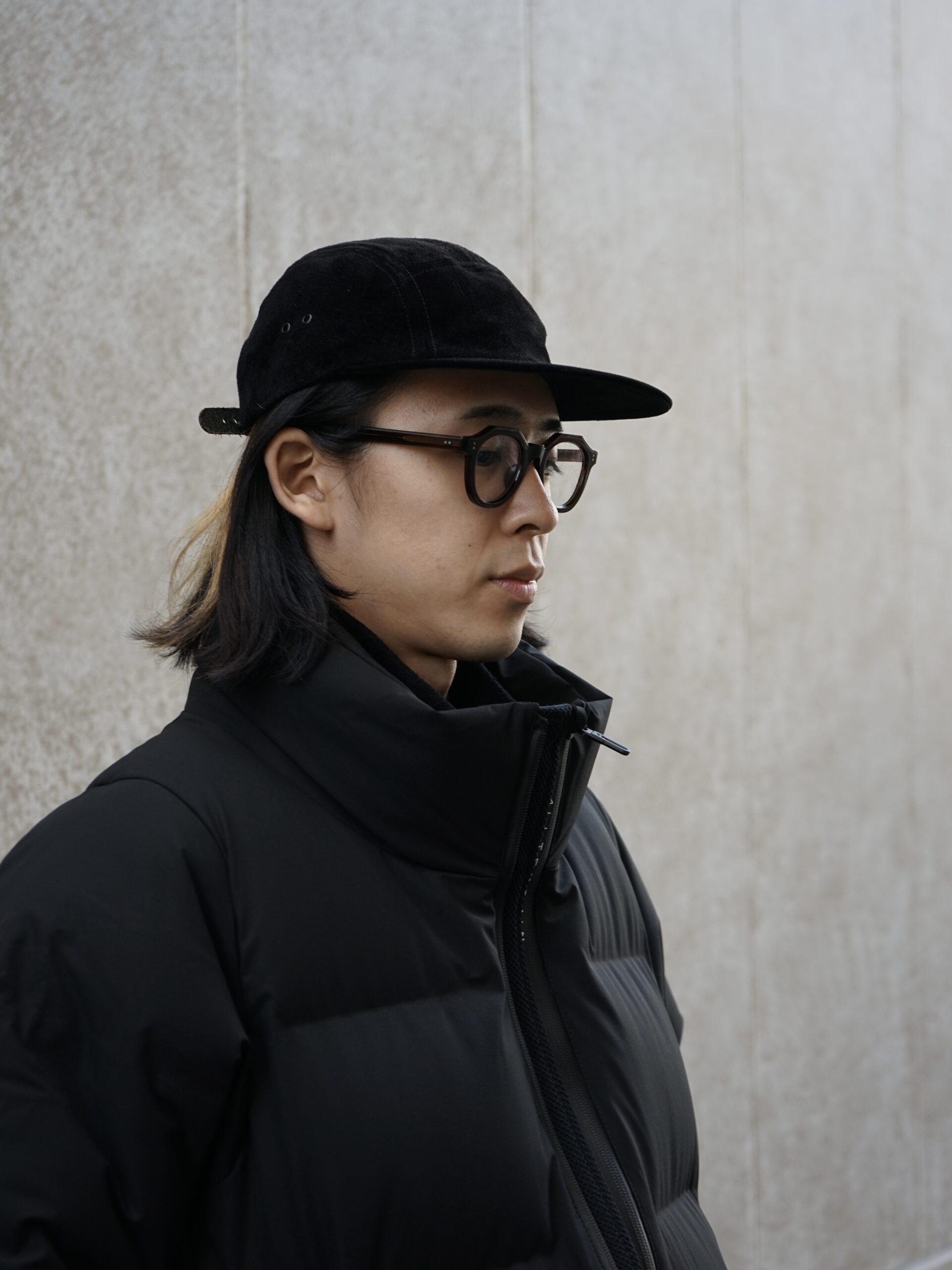 DESCENTEとGraphpaperとのコラボレーションによるダウンジャケット、DESCENTE for Graphpaper ”Oversized ANCHOR”。前回同様にDESCENTEを象徴する初期モデル、「ANCHOR」をベースにスポーツウェアのように身体へ密着させて保温性を高める設計ではなく、都市生活における快適性と余白あるシルエットを重視して再構築しました。肩の傾斜を美しく見せるパターンワークや、人気モデル「マウンテニア」にも採用されるセットインラグランスリーブにより、襟から袖口にかけて自然な丸みを帯びた洗練されたフォルムを実現しています。