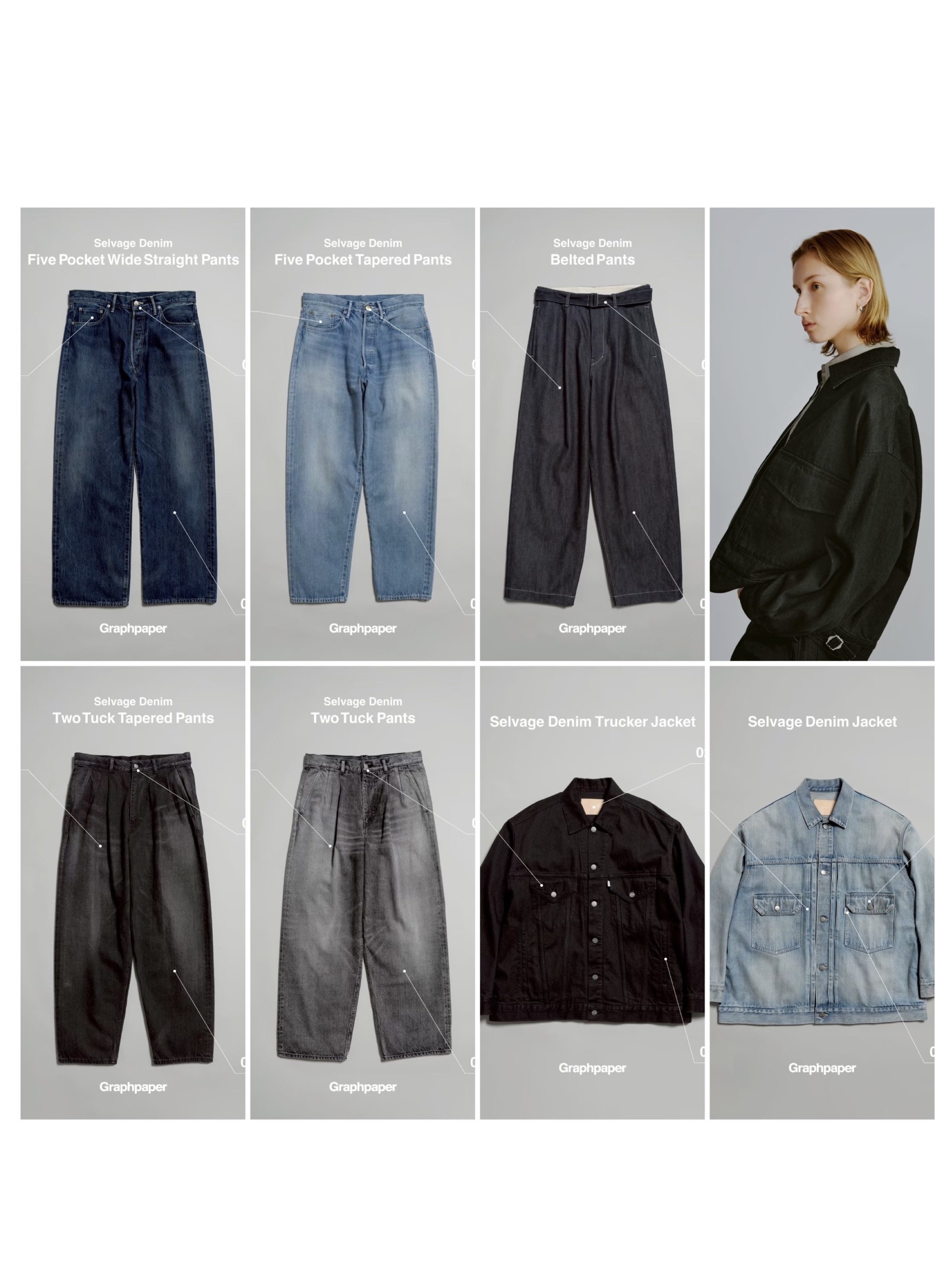 1/24(土)に、ブランドの定番“Selvage Denim”が再入荷。INDIGOカラーとBLACKカラー、どちらも全てのアイテムが再入荷となり充実したラインナップで圧巻のデニムコレクションを展開いたします。どちらのカラーも「RIGID.WASHED」「DARK FADE」「LIGHT FADE」の濃淡と奥行きのある3色のラインナップ。ジャケットはすっきりとした丈が特徴のTrucker JacketとZip Jacket、カバーオールのようなたっぷりとした着丈が特徴のDenim Jacketを展開。パンツは共地のベルトと深いタック・ワイドシルエットが特徴のBelted Pants、定番のTwo Tuck Pants、デニムの王道とも言えるオーセンティックなFive Pocket Pantsを展開。徹底的にこだわり抜いた素材を使用し、Graphpaperのフィルターを通して完成した渾身のデニムコレクション。ぜひ店頭・WEB STOREにてご覧ください。