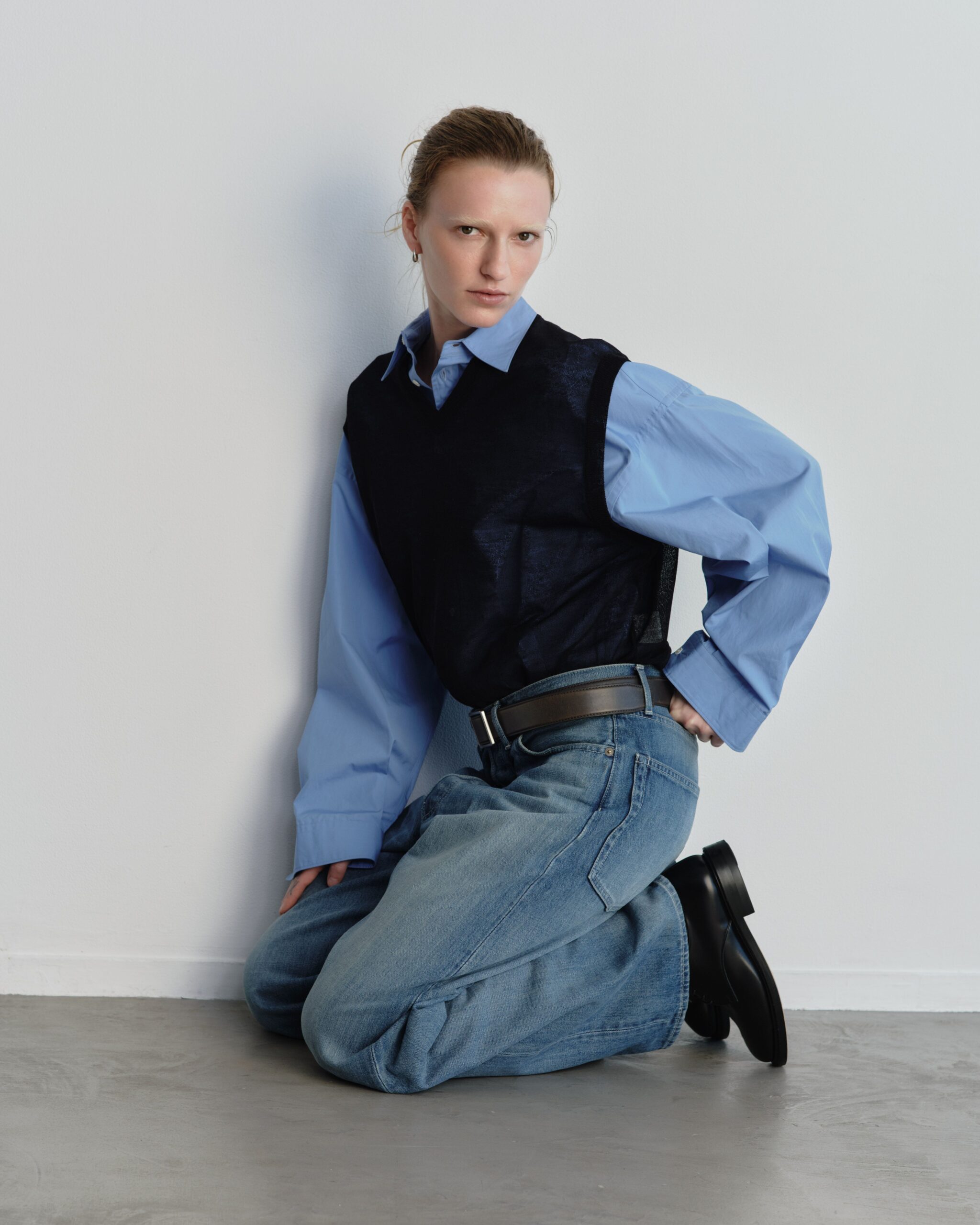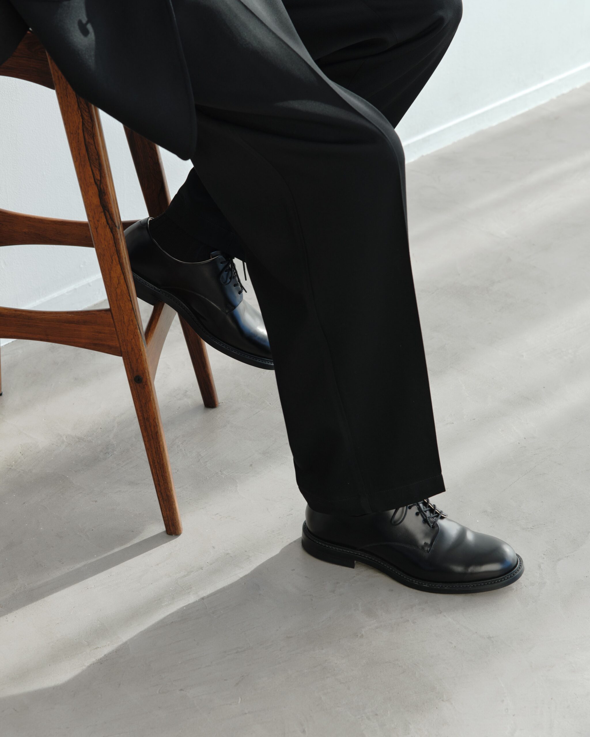 「定番として長く履き続けられる革靴」をコンセプトに企画された本作は、一見すると極めてベーシックな佇まいでありながら、〈Graphpaper〉らしいバランス感覚と、〈BEAUTIFUL SHOES〉が持つ高度な技術が詰まっています。アッパーには、原皮の選定から行ったオリジナルレザーを採用。天然のテクスチャーを活かすことで生まれる均等なシボ感や履きジワの出方、ライニングのトーンに至るまで細やかに設計されています。ソールはレザーソールをベースに、ヒール部分のみにダイナイトソールを配した仕様。革靴らしい歩行感を保ちながら、耐久性と実用性を兼ね備え、日常的な着用を前提としたバランスに整えました。カジュアルからドレスまで幅広いスタイリングに馴染む〈Graphpaper〉の新たな定番となるレザーシューズが完成しました。